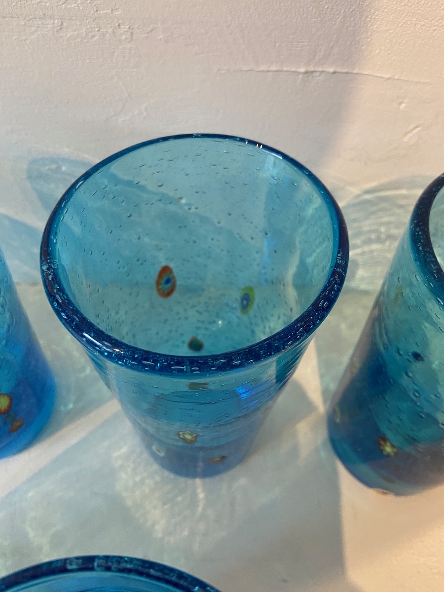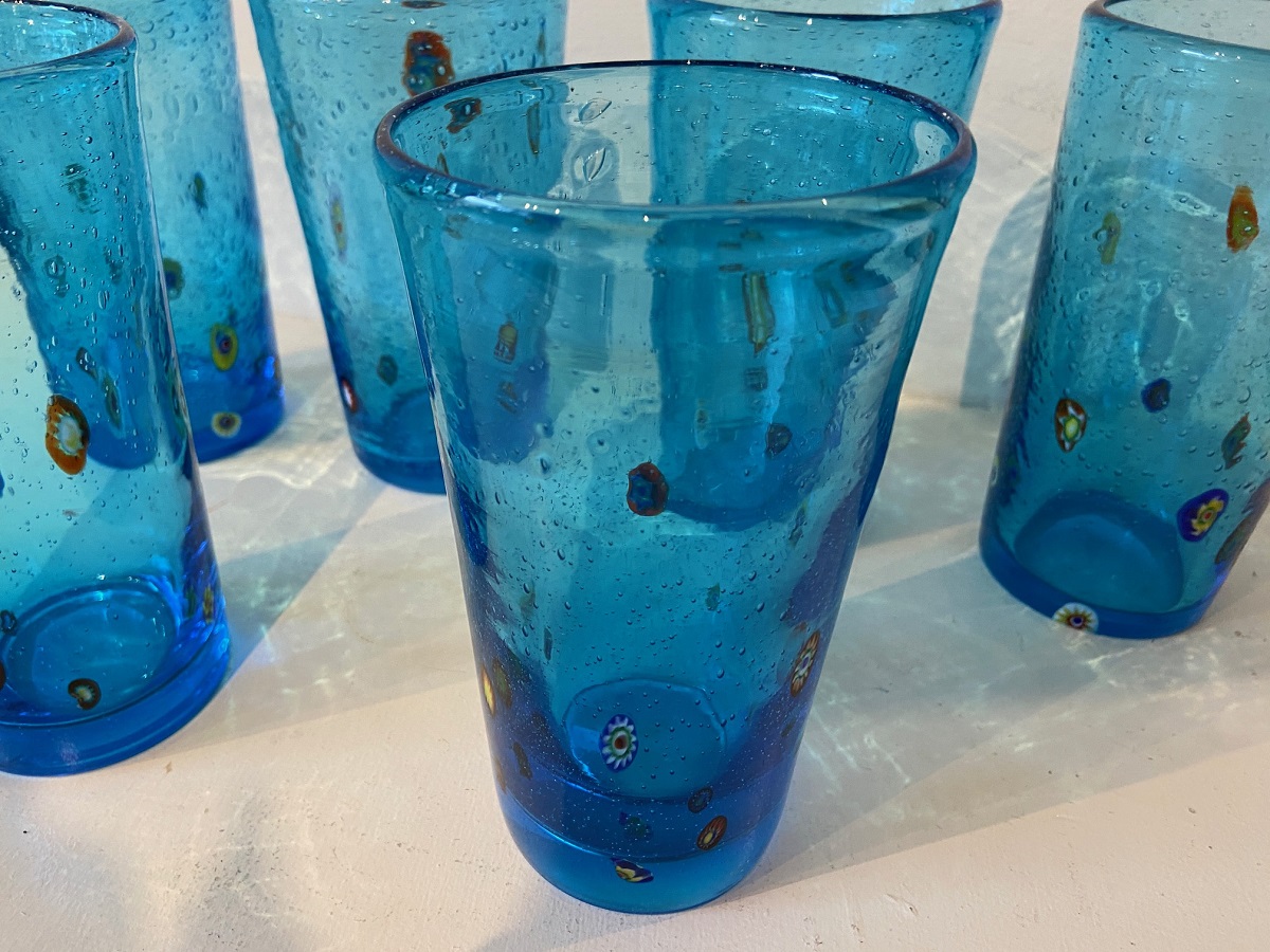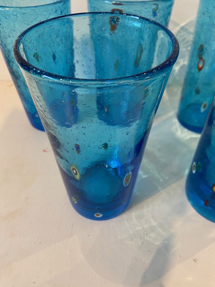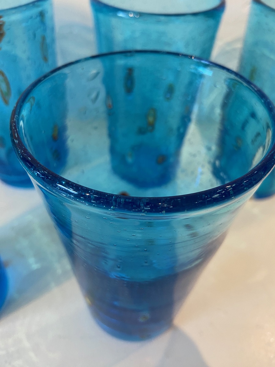 Stel van zes blauwe glazen van Leonardo. Hoogte c.a. 17 cm, diameter c.a. 9,5 cm In perfecte staat en de afmetingen zijn licht verschillend maar nauwelijks te zien (zie de foto)! Kleur op foto kan door invloed van verlichting afwijken!