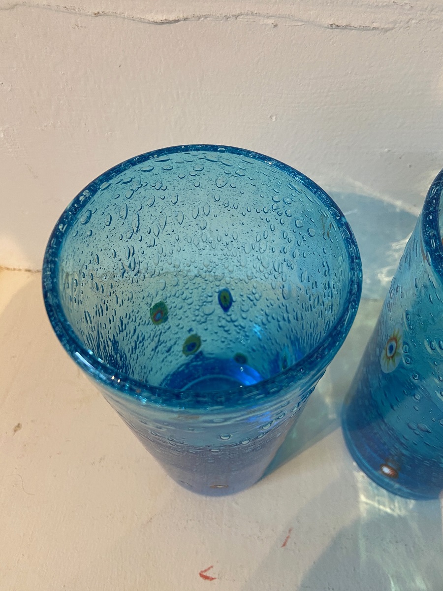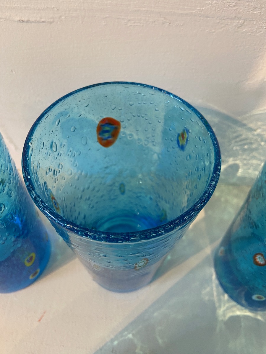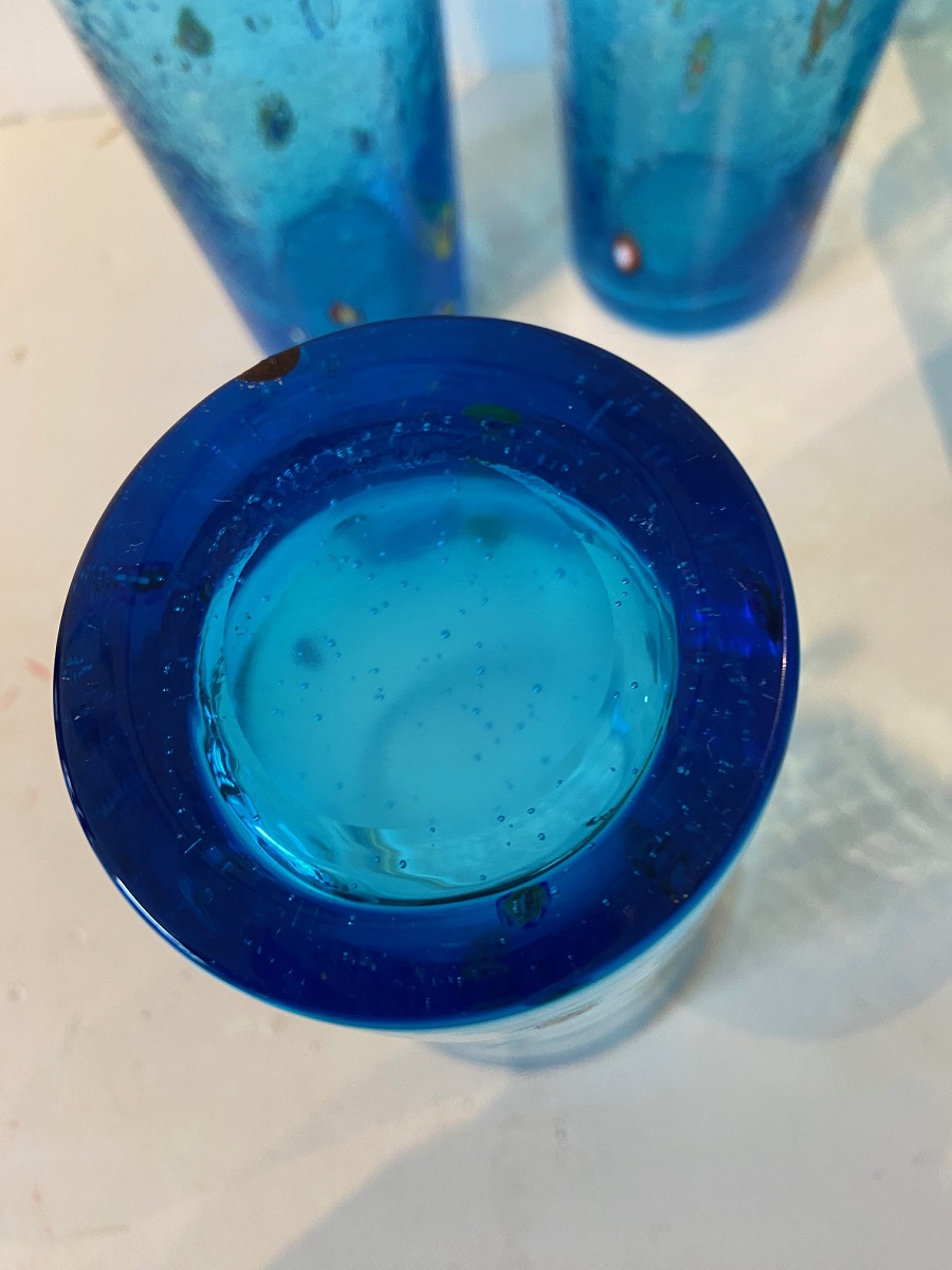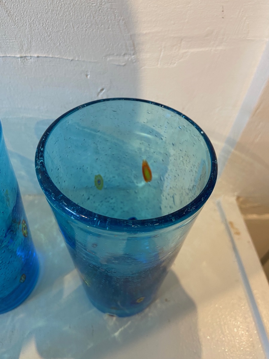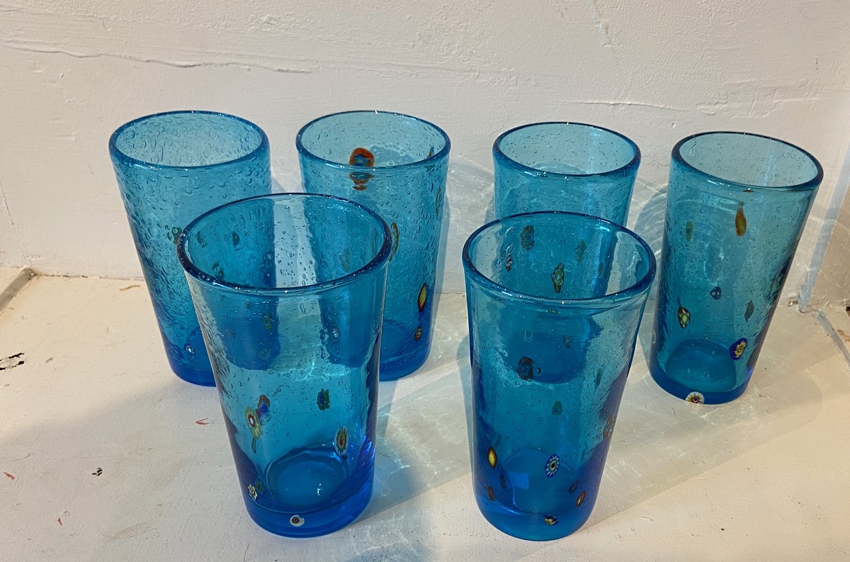 Stel van zes blauwe glazen van Leonardo. Hoogte c.a. 17 cm, diameter c.a. 9,5 cm In perfecte staat en de afmetingen zijn licht verschillend maar nauwelijks te zien (zie de foto)! Kleur op foto kan door invloed van verlichting afwijken!