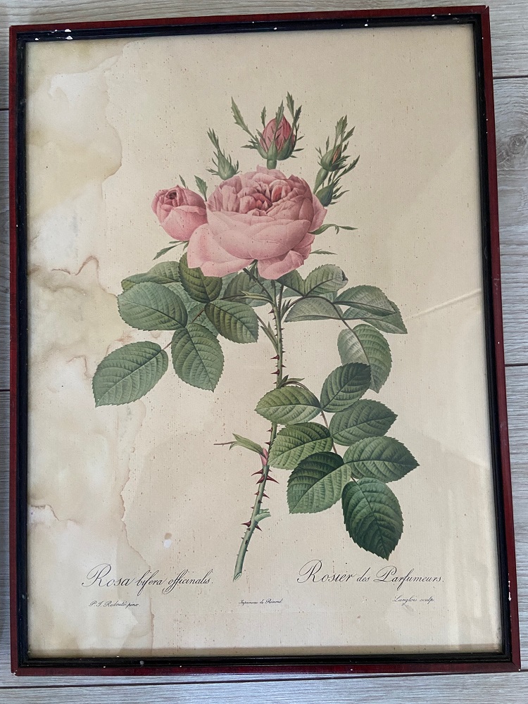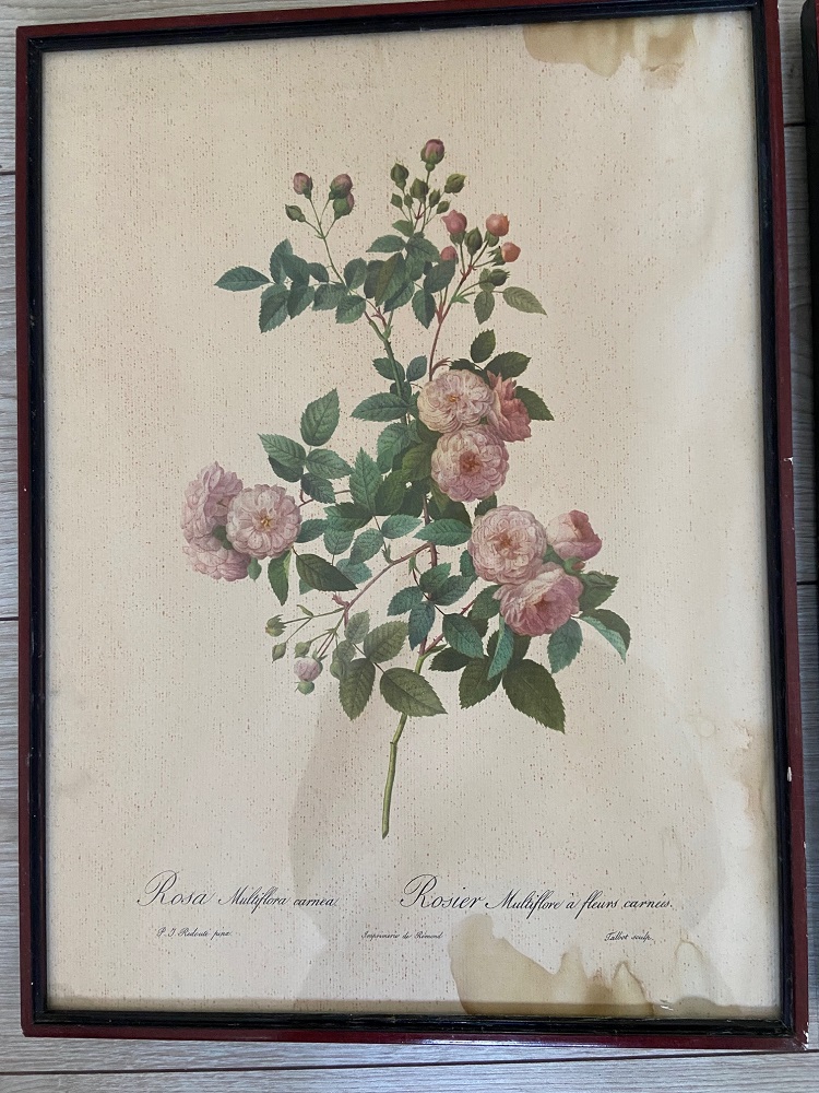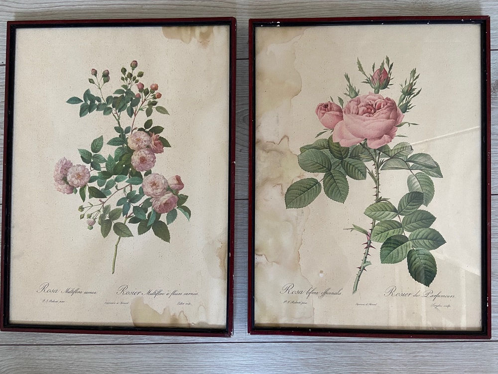 Stel prenten van rozen in lijst. Afmeting per lijst: 42 bij 31 cm. Waterschade.
